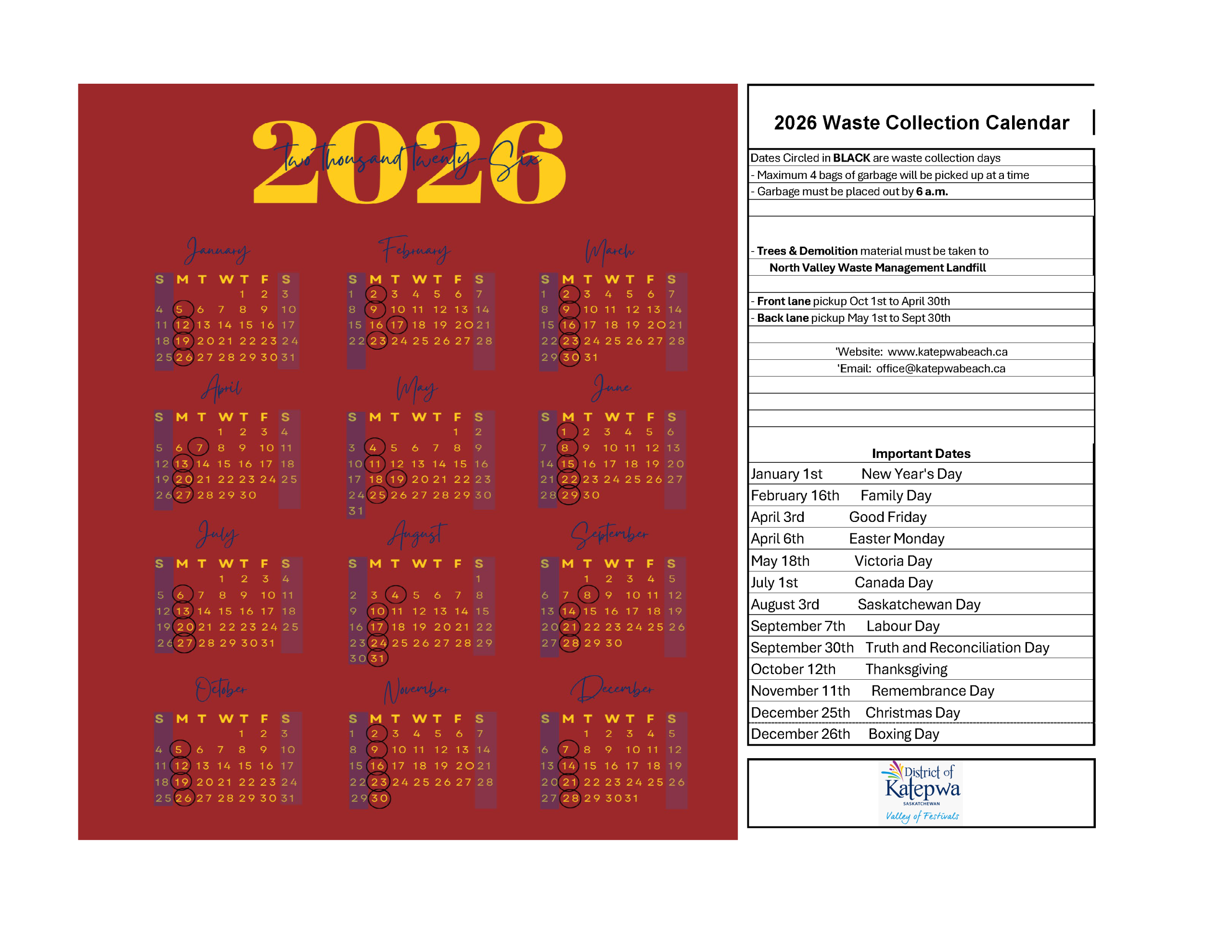 - The District of Katepwa will only pick up 4 household garbage bags placed in containers.